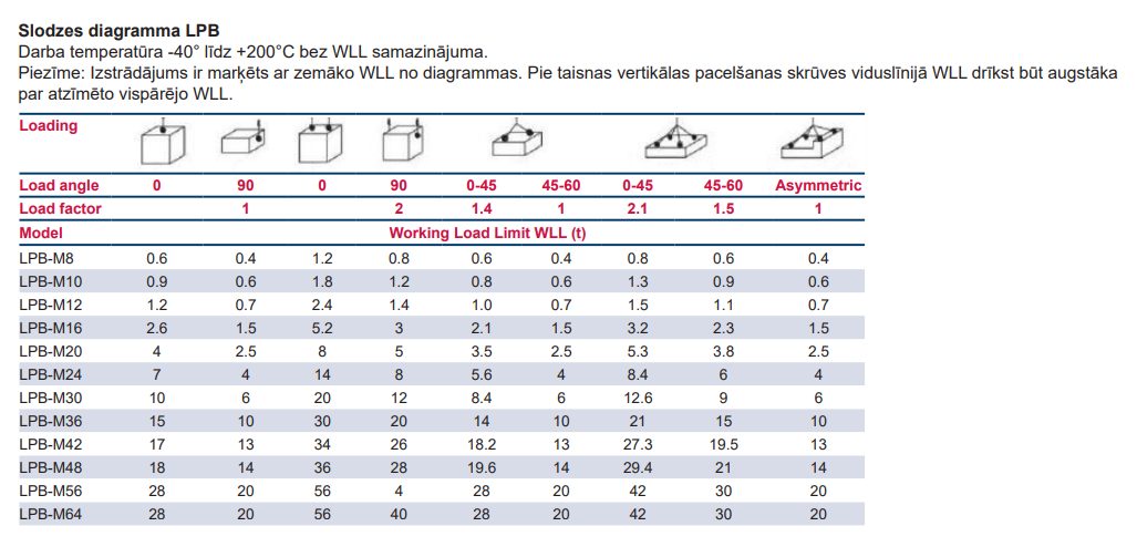 - WLL indikācija: LPB ir atzīmēts ar zemāko WLL 90° kā vispārējais WLL. WLL diagramma nodrošina augstāku WLL taisnai vertikālai slodzei.