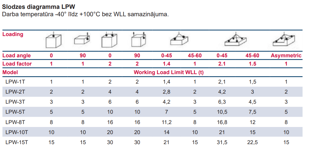 - Piezīme: LPW ir WLL (Working Load Limit) novērtējums, pieņemot, ka pareizo metināšanas procedūru rūpīgi ievēro un veic atbilstoši kvalificēts metinātājs, lai saglabātu izstrādājuma integritāti un atbilstību drošības noteikumiem.